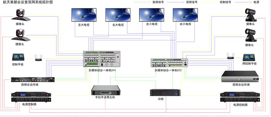 航天某部会议室采用2台视通科技UT综合一体机作为两个视频会议网络的多媒体控制核心,分别管理两个网络的音频、视频设备,从而实现双网双控。两网系统共用一套麦克风、音箱及大屏幕,但音视频信号及控制相互独立。